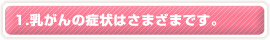 乳がんは乳腺(母乳をつくるところ)に発生する悪性腫瘍です。 症状は、しこり、痛み、血液が混じったような分泌物がでる、乳首のただれ、皮膚のくぼみ、赤くはれたりオレンジの皮のように毛穴が目立つ、わきの下のしこりなど、実にさまざまです。 乳がんの初期には食欲が減ったり体調が悪くなるなどの全身症状はほとんどありません。気づかずにそのまま放置しておくと、乳腺の外にまでがん細胞が増殖し血管やリンパ管を通って全身へと広がっていきます。乳房のわずかな変化を見逃さないことが大切です。 |